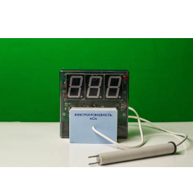 Модуль «ЭЛЕКТРОПРОВОДНОСТЬ» соединен проводом с трубкой, в которой зафиксированы два щупа для погружения в жидкость. На задней панели измерительного блока расположен магнитный держатель, позволяющий крепить блок к магнитной доске.