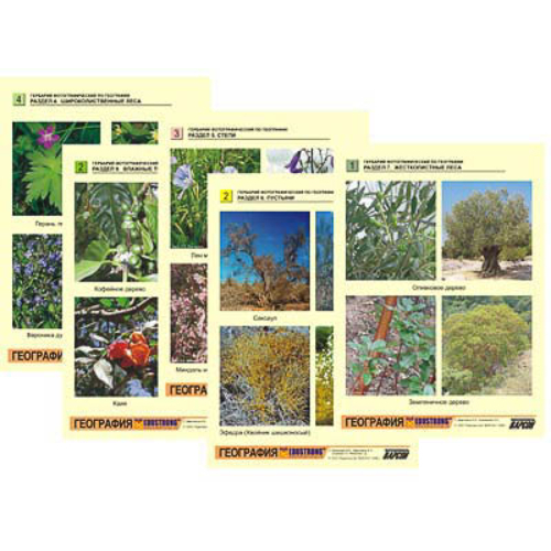 В комплект входят 32 листа с описаниями по разделам: «Арктические пустыни. Тундры», «Хвойные леса. Широколиственные леса», «Степи. Пустыни», «Жестколистные леса. Саванны. Влажные тропические леса».