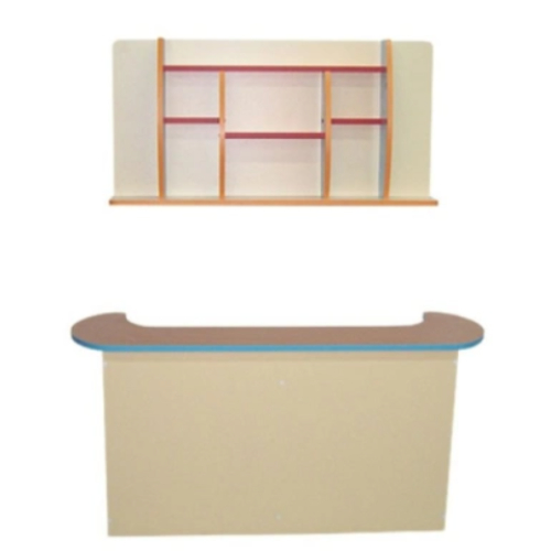 Описание: Основной цвет бук или кремовый. Фасады цветные по желанию заказчика. Состоит из двух отдельных элементов. Первый — стойка "барная" со скругленной со всех сторон столешницей и с выемкой со стороны "бармена", внизу, в закрытой части две полочки. Второй элемент — навесная полка, разделенная с помощью вертикальных перегородок и полочек на 6 ячеек.