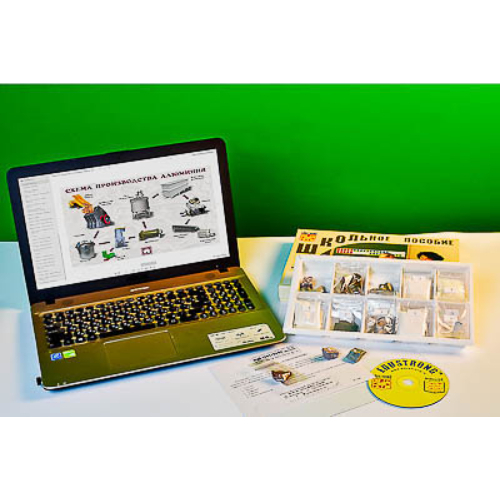 Образцы пронумерованы и помещены в коробку с ячейками. Комплектуются ламинированным вкладышем, содержащим информацию о свойствах, производстве и применении алюминия.