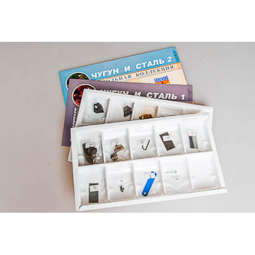 Образцы пронумерованы соответственно списку и упакованы в коробку с ячейками. Коллекция сопровождается руководством по эксплуатации и двумя ламинированными вкладышами со схемами производства чугуна и стали.