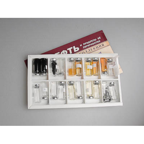 Состав коллекции: сырая нефть, мазут, пластмасса, каучук, вазелин, парафин, соляровое масло, веретенное масло, машинное масло, цилиндровое масло, гудрон, бензол, толуол, нефтяной газ, петролейный эфир, бензин, лигроин, керосин, газойль, соляр, крекинг керосин, крекинг бензин.