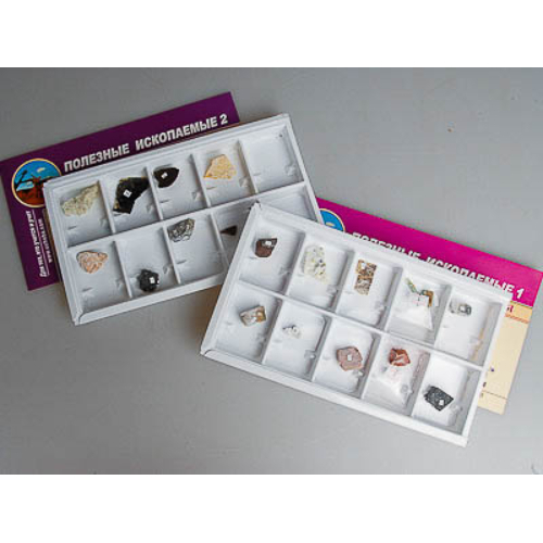 Образцы пронумерованы соответственно списку и разложены в две коробки с ячейками. Пособие комплектуется руководством по эксплуатации и ламинированным вкладышем, содержащим информацию о внешнем виде, месторождениях и применении полезных ископаемых.