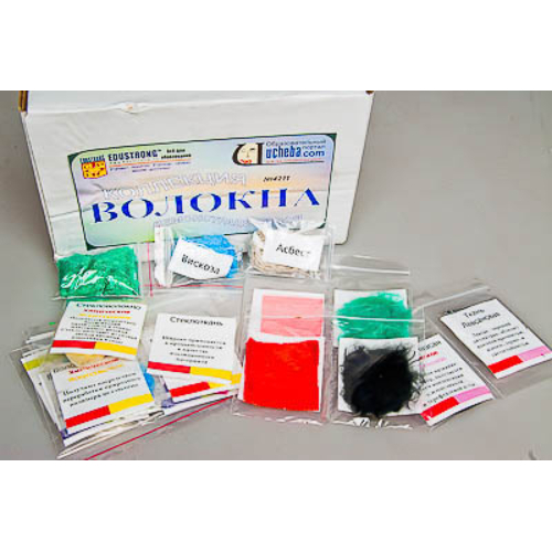 Коллекция включает образцы волокон и изготовленных из них тканей. Образцы разложены в пакеты с этикетками, содержащими название образца, тип волокна и краткую информацию о его свойствах, получении и применении. Также коллекция включает образцы волокон (расфасованы в маленькие пакетики с этикетками), предназначенные для расходования при проведении опытов по идентификации волокон и определении их свойств. Пособие комплектуется руководством по эксплуатации и ламинированным вкладышем, содержащим классификацию волокон, информацию об их свойствах, производстве и применении.