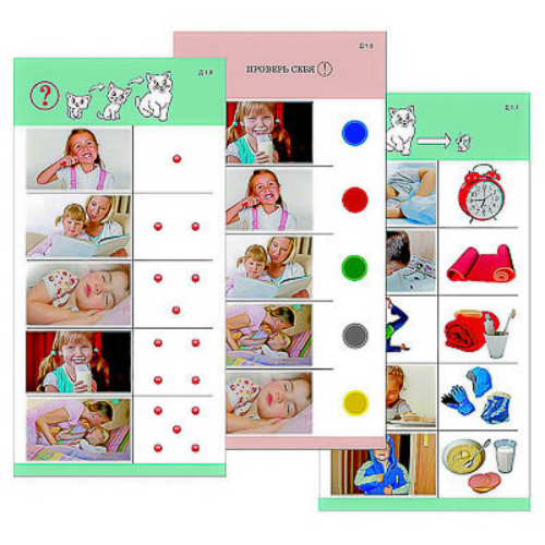 Пособие состоит из 10 полноцветных, напечатанных на картоне и ламинированных пленкой карточек. Является частью игрового набора "Обучающий калейдоскоп для дошкольного образования".