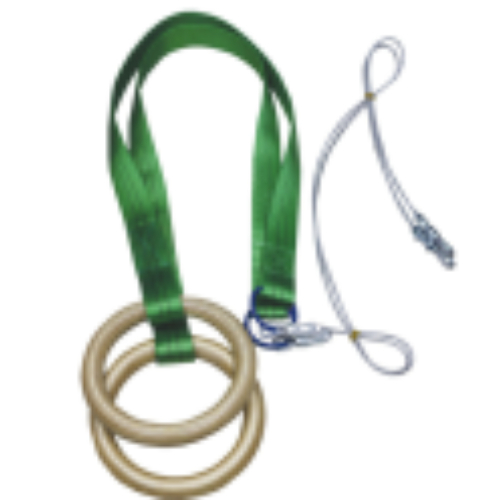 Кольца гимнастические представляют конструкцию, состоящую из: колец, ленты и троса. Соединение троса с лентой с помощью коушами и скоб, что предохраняет трос от скручивания. Внутренний диаметр кольца 180 мм, внешний диаметр кольца 235мм , диаметр сечения кольца 28 мм. Общая длина подвеса 3 м(1 м стропа, 2 м трос). Материал кольца фанера 30 мм, лента ЛБС — 35, трос диаметром 4 мм в трубке. Гимнастические кольца крепятся либо на блочной подвеске, либо на консоли (поставляется отдельно).