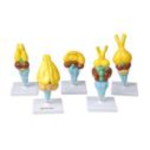 Комплект состоит из 5 моделей головного мозга позвоночных животных. Модели демонстрируют внешнее строение головного мозга позвоночных. Модели неразборные, изготовлены из гипса и снабжены пластмассовыми подставками. Для удобства на моделях отделы мозга обозначены контрастными цветами.