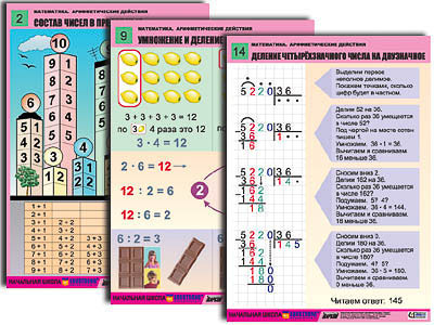 Таблицы: 1. Способы сложения и вычитания чисел в пределах 10. 2. Состав чисел в пределах 10. 3. Названия чисел при сложении и вычитании. 4. Способы сложения и вычитания чисел в пределах 20. 5. Устные приемы сложения чисел в преде­лах 100. 6. Устные приемы вычитания чисел в преде­лах 100. 7. Письменное сложение и вычитание чисел в преде­лах 100. 8. Названия чисел при умножении и де­лении. 9. Умножение и деление. 10. Деление с остатком. 11. Письменное умножение трёхзначного числа на однозначное. 12. Письменное деление трёхзначного числа на однозначное. 13. Умножение четырёхзначного числа на двузначное. 14. Деление четырёхзначного числа на двузначное.