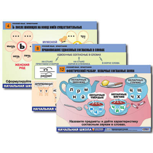Таблицы: 1. Правописание безударных гласных в корне слова. 2. Правописание парных согласных в корне слова. 3. Правописание непроизносимых согласных в корне слова. 4. Ь после шипящих на конце имён существительных. 5. Правописание разделительных Ъ и Ь. 6. Правописание –ТЬСЯ и –ТСЯ в глаголах. 7. Правописание Ь в окончаниях глаголов 2-го лица единственного числа. 8. Правописание удвоенных согласных в словах. 9. Правописание приставок и предлогов. 10. Правописание безударных падежных окончаний имён существительных. 11. Фонетический разбор. Йотированные буквы. 12. Фонетический разбор. Непарные согласные звуки. 13. Фонетический разбор слова. 14. Разбор слова по составу.