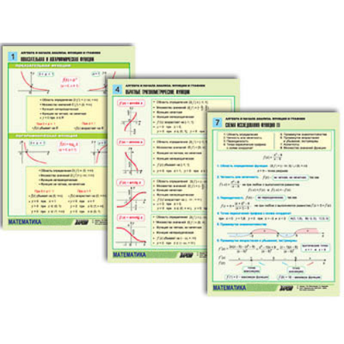 Пособие состоит из 8 полноцветных таблиц формата А4, ламинированных глянцевой пленкой: 1. Показательная и логарифмическая функции. 2. Тригонометрические функции (1). 3. Тригонометрические функции (2). 4. Обратные тригонометрические функции. 5. Свойства функций. 6. Исследование функций с помощью производной. 7. Схема исследования функции. (1) 8. Схема исследования функции (2).