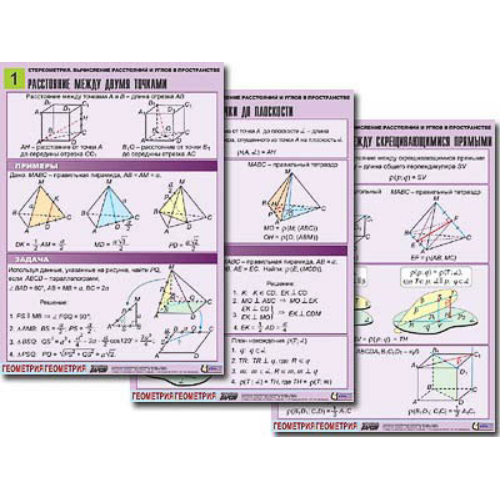 2. Комплект учебно-наглядных пособий формата А1 с полноцветной двухсторонней печатью и матовой двухсторонней ламинацией в количестве 8 таблиц: 1. Расстояние между двумя точками. 2. Расстояние от точки до прямой. 3. Расстояние от точки до плоскости. 4. Расстояние между скрещивающимися прямыми. 5. Угол между скрещивающимися прямыми. 6. Угол между прямой и плоскостью. 7. Двугранные углы. 8. Угол между двумя плоскостями.