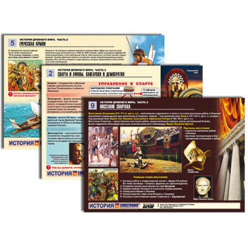 Пособие состоит из 12 полноцветных таблиц формата А4, ламинированных глянцевой пленкой. Таблицы: 1. Микенская цивилизация. 2. Спарта и Афины. Олигархия и демократия. 3. Греко-персидские войны. 4. Олимпийские игры. 5. Греческая армия. 6. Завоевательные походы Александра Македонского. 7. Пунические войны. Рим и Карфаген. 8. Римская республика в III в. до н. э. 9. Восстание Спартака. 10. Римский легион. 11. Памятники искусства и архитектуры Древнего Рима. 12. Зарождение христианства.