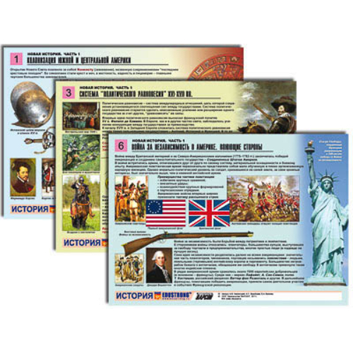 Таблицы: 1. Колонизация Южной и Центральной Америки. 2. Реформация. Религиозные течения. 3. Система "политического равновесия" XVI–XVII вв. 4. Эпоха Возрождения. Леонардо да Винчи. 5. Быт европейца XV–XVIII вв. 6. Война за независимость в Америке. Воюющие стороны.