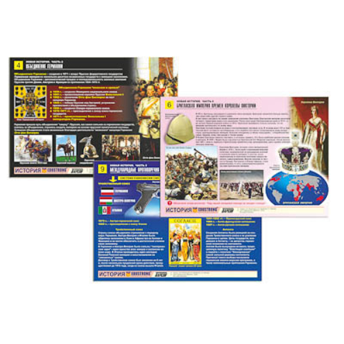 Таблицы: 1. Индустриальная революция. Технический прогресс. 2. Французская буржуазная революция. 3. Завоевательные войны Наполеона. 4. Объединение Германии. 5. Гражданская война в США. 6. Британская империя времен королевы Виктории. 7. Парижская коммуна 1871 г. – первая пролетарская революция. 8. Основные идеи общественно-политических учений ХIХ в. 9. Международные противоречия накануне Первой мировой войны. 10. Архитектура Индустриальной эпохи.
