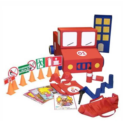 В комплекте: Машина пожарная (150*80*80 см.) — 2шт., комплект знаков по пожарной безопасности (7 шт.) — 2 компл., подставка для знаков — 14 шт., огнетушитель — 4 шт., жилет пожарного — 4 шт., шлем пожарного — 4 шт., макет здания (100*50*50 см.) — 2 шт., пожарный рукав (2,5 м.) — 2 шт., ограждения (брус 20*20*100см.) — 4 шт., сумка для инвентаря — 2 шт.