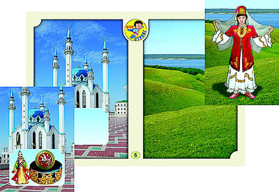 Каждое игровое поле посвящено одному региону России. На карточках изображены женщины в национальных костюмах и памятники архитектуры, характерные для определенного этноса России; они служат продолжением изображений на игровых полях и содержат общие с ним детали фона. На карточках с изображением зданий (сооружений) дана врезка, на которой представлены предметы декоративно-прикладного искусства, являющиеся визитной карточкой данного народа.