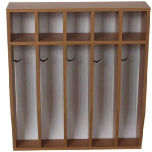 Материал: Основа ЛДСП. Задняя стенка, основные элементы бук или кремовые, кромка цветная. Полка разделенна на пять вертикальных отделений, в верхней части которых находится полочка. В каждом отделении к боковой стенке прикреплены два крючка для полотенец. Задняя стенка – ламинированное ДВП.