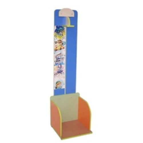 Описание: Основной цвет бук или кремовый. Фасады цветные по желанию заказчика. Стойка из цветного ЛДСП, внизу площадка с бортиками, со стороны стены — двойная панель из ЛДСП с наклейкой и указанием сантиметров, посередине, в отверстии бегунок с горизонтальной планкой для измерения роста, в самом верху двойной панели — ограничитель фигурной формы.