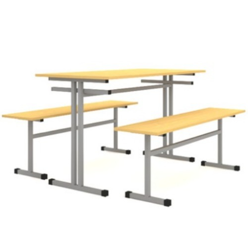 Стол обеденный 4-х местный, оборудованный двумя скамьями. Каркас изготовлен из металлической трубы квадратного сечения 25х25 мм, с полимерно-порошковой окраской в светло-серый цвет. Столешница стола выполена из пластика 16 мм., сидение скамьи из ЛДСП 16 мм.