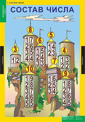 В состав комплекта входят 8 таблиц (формат 68*98 см): 1. Состав числа. 2. Точка, луч, линия. 3. Неравенства. 4. Равенства. 5. Компоненты сложения. 6. Решение задач. 7. Многоугольники. 8. Компоненты вычитания.
