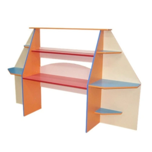 Описание: Основной цвет бук или кремовый. Фасады цветные по желанию заказчика. Уголок представляет собой стол с двумя высокими сегментами по бокам. Над столом сегменты соединены между собой двумя открытыми полками, столешница со стороны стены имеет бортик из ЛДСП фигурной формы. Сегменты симметричны, на уровне столешницы большая полка, ниже и выше две полочки меньшего размера.