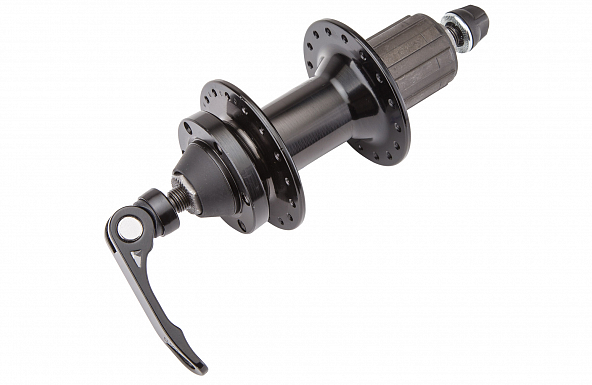 Втулка задняя JA259RR на 32 спицы, с быстросъёмным зажимом, под диск на 6 болтов, осевое расстояние O.L.D. 135мм, диаметр фланцев по отверстиям для спиц 58 мм, под кассету на 8/9 скор., ось M10 x 145мм, алюминиевая, чёрная